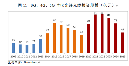 其次是价,MassiveMIMO技术对高速率光模块需求将进一步推动其价格上涨。根据调研,4G普遍应用的10G光模块价格仅为几百元,而5G时代将大规模应用25/100G光模块价格,价格提升一个量级,即使考虑100G光模块大规模应用后价格的大幅下降,25/100G光模块价值量依旧高于10G光模块。因此,基于光模块量价齐升的趋势,我们预测运营商在5G时代光模块投资约650-770亿,是4G的5-6倍。