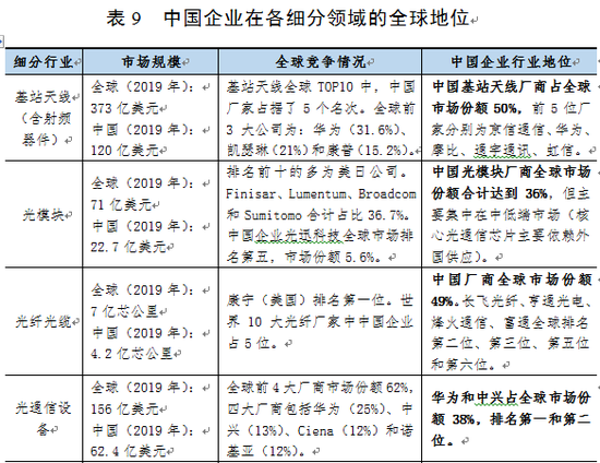 从表8可以看出:在设备集成领域,中国企业在全球市场上具有很强的优势,主要体现在华为和中兴在全球设备市场排名前5位且占有较高市场份额。在基站天线和光纤光缆领域,中国企业发展成熟且整体优势明显。但在涉及高端芯片和高端器件的光模块及手机射频前端领域,中国企业与日美发达企业差距明显。