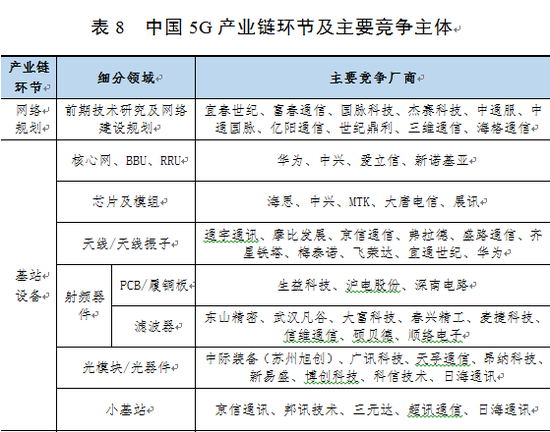 从市场竞争的角度来看,5G通信产业主要包括网络规划设计、无线主设备、传输设备、终端设备、运营商以及用户6个环节,目前,由于5G还未实现商用推广,因此,企业间的竞争主要集中在前5大环节,主要针对5G基础网络建设所需要的软硬件设备、网络规划连接、终端应用设备开发等方面展开竞争。