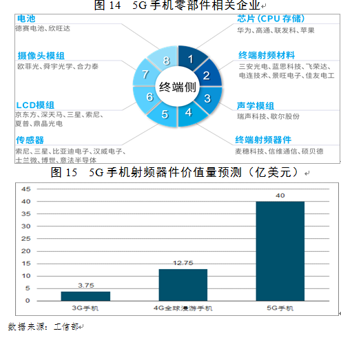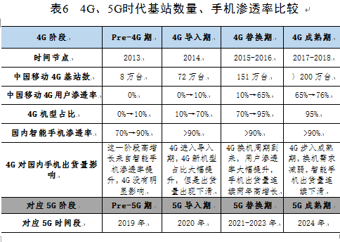 在全球智能手机出货量持续萎缩下,5G商用将掀起一波换机潮。一方面,终端厂商推出5G手机速度会快于基站建设速度。从4G发展经验来看,终端厂商在4G牌照颁布后,新发机型中4G手机占比会快速提升,2014年国内4G用户渗透率不足10%,但4G手机出货量占比从年初10%迅速提升到年底70%,渗透率快速提升是因为国内4G建设较晚、全球4G终端已经成熟,同时也是厂商对于手机卖点和向后兼容性的考虑;展望5G,我们认为2020年5G手机占比会开始逐步提升并持续三年。
