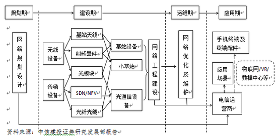 5G产业具有产业链长,涉及领域广等特点,同时对上下游行业具有明显的带动效应。上游主要包括无线设备(基站天线、射频模块、基带芯片、小基站等)、传输设备(光器件与光模块、光纤光缆、SDN/NFV解决方案等);中游主要是运营商;下游包括终端设备(可穿戴、车联网、VR/AR等)及一些应用厂商。当前,5G还处于建设期阶段,上游受到5G网络架构变革,在材料和技术上将会有新选择,目前仍处于重塑阶段。
