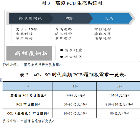 5G的基站天线采用MassiveMIMO技术,将4G时期的无源天线+RRU的配置,改进成了有源天线(AAU)。同时,5G要求峰值速率更高,天线通道数从4G时期4T4R变为64T64R,复杂程度提高,产业链环节中天线振子、PCB板以及射频模块中滤波器、功率放大器在用量提升的同时材料方面相应变革。