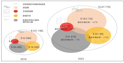 图5 射频前端整体市场、细分市场的规模与变化(美金)