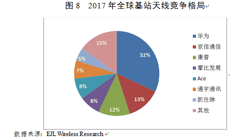 国内基站天线厂商已拥有全球核心技术:目前,国内天线厂商经过十多年的发展阶段:2000年以前为空白期,天线产业几乎100%依赖进口;2001年至2010年进口替代期,国内天线品牌本土市场占有率从2002年25%提升至2006年90%;2011年至今行业整合期,受运营商过去5年投资放缓影响,天线行业在激烈的竞争中已进行整合。根据EJL的数据,国内天线厂商份额占比提高明显,2017年,在全球宏基站天线发货量为453万中,中国企业占前十大天线厂商半数,发货量占比超过60%。其中,华为的天线市场份额占比为全球最高,约32%,京信通信占13%,摩比占8%,通宇占比约7%。