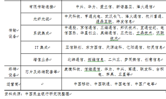 目前,各环节的主流厂商包括系统平台综合集成的华为、中兴通讯、烽火通信、新华三、星网锐捷;大数据应用的东方国信、天源迪科、拓尔思;物联网平台与解决方案的宜通世纪、高新兴、拓邦股份;增值业务服务与平台的北纬通信、拓维信息、四维图新、梦网荣信等。云计算领域则有IasS/PasS层的金山软件、PasS层的金蝶国际及中软国。