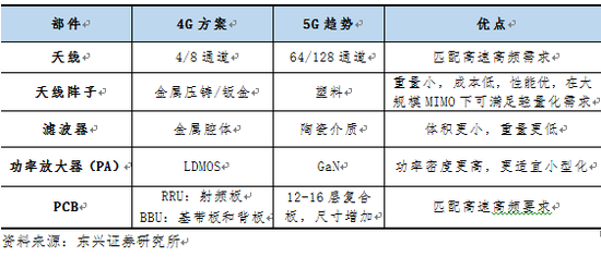 表1 5G天线射频零部件与4G对比一览表