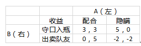 A,B两个嫌疑人被抓捕,分开审讯,都面临两种选择,要么守口如瓶,要么出卖队友。如果两个人都守口如瓶,两个人都会被无罪释放,各自收益为3。