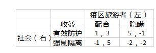 疑似患者和疫区旅游史的人可以选择配合,把自己过往旅游、接触史和盘托出,这样,社会可以很好地判断是否需要把他隔离了,还可以追踪其他接触过的人,进行迅速隔离,这样对于社会收益是最大的3,这些人也有一定好处,比如,自己的症状可以得到药物、治疗,如果是新冠肺炎,可以第一时间得到救助,收益为1。