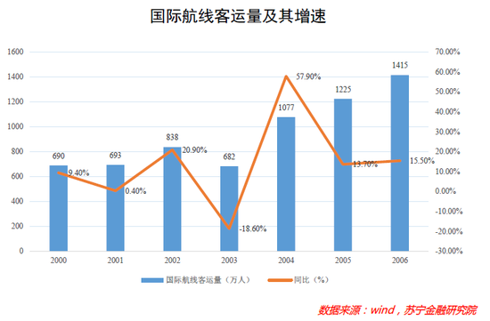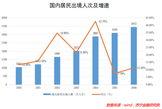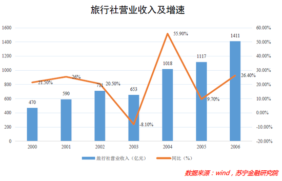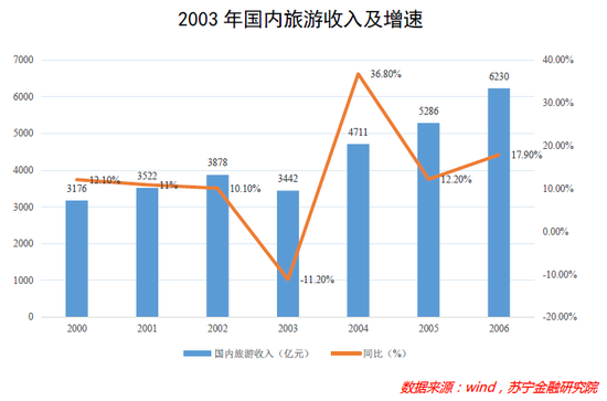 从国家统计局公布数据来看,2003年全年出境人次同比增速为21.8%,比2002年的34.8%降低了13pct;当年的旅行社营业收入同比下降 8.1%,比2002年的20.5%降低了28.6pct;不过在次年,出境人次及旅行社收入均呈现出大幅反弹。