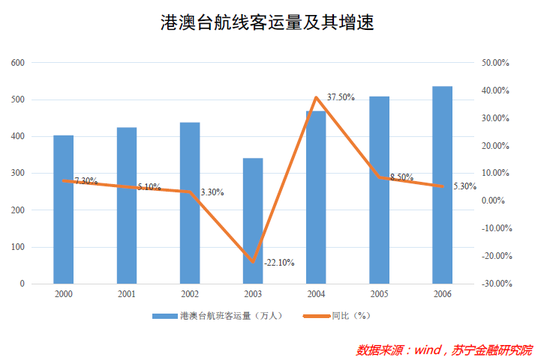 另外,非典疫情同样对航班客运量造成了冲击,但随后同样呈现出明显的反弹趋势。从航班客运量来看,2003年民航国际航线客运量同比下降18.6%,比2002年的20.9%骤降了39.5pct;港澳台航线客运量同比下降 22.1%,比2002年的3.3%骤降了25.4pct。疫情结束之后,2004年民航国际航线客运量和港澳台航线客运量又分别迎来57.9%和37.5%的高速增长。