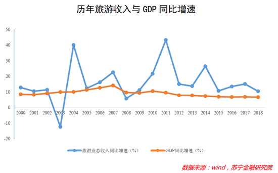 消费升级叠加政策支持的结果,是旅游业快速的发展壮大。从数据上看,2019年我国旅游业总收入高达6.63万亿元,国内旅游人数60.06亿人次,入出境旅游总人数3.0亿人次;且新世纪以来的绝大多数年份里,旅游业收入同比增速均高于GDP增速;贡献了近8000万个就业岗位,对国民经济发展意义深远。