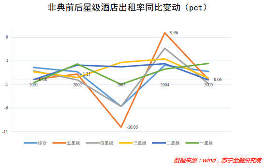 在2004年的反弹期,全国星级酒店出租率整体同比反弹3.10pct,其中五星级酒店出租率大幅上升了20个百分点;星级酒店营业收入同比增长高达26.0%,其中一星级酒店营业收入在2003年低基数效应下,同比增长74.8%,反弹最快。