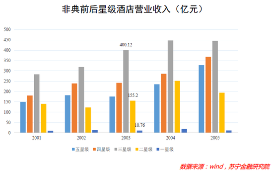 2003年全国星级酒店出租率整体下滑4.01%,五星级酒店出租率下滑最大,达到10.05pct;酒店整体营业收入同比增长7.5%,增速较2002年下滑了12.3pct,其中一星级酒店营收下滑幅度最大,同比负增长15.5%。