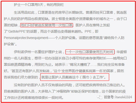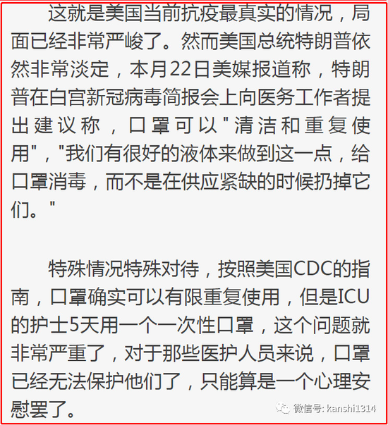 大家再看看美国现在的状况,口罩紧缺到什么程度了。重症护理护士,一个一次性口罩要使用五天时间。