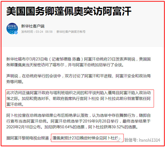 最后,我再告诉大家一个消息,当大家关注美国疫情的时候,知道蓬佩奥去哪儿了吗?去阿富汗了。