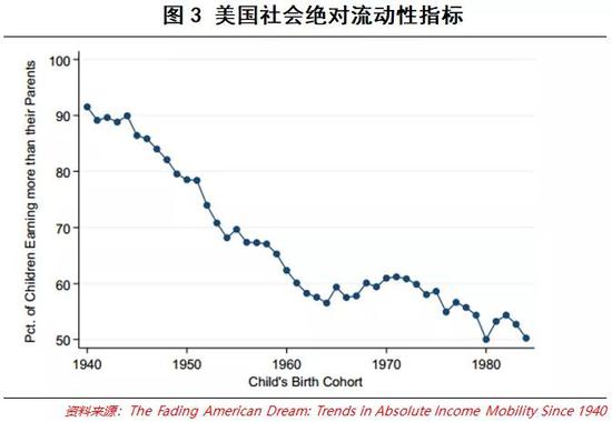 衡量阶层固化的一个指标是“绝对流动性”(Absolute Mobility),即全社会子女30岁时收入超过其父母 30 岁时收入的比例,这一比例越高,说明下一代人实现阶层跃升的希望越大。