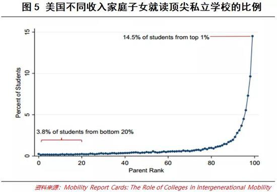 本来高等教育是实现阶层跃升的最有效途径,但美国现在的高等教育实际上是在加剧阶层固化。在美国顶尖私立大学(常春藤联盟、芝加哥、斯坦福、麻省理工、杜克大学)中,来自底层20%家庭的学生只有3.8%,来自底层50%家庭的学生只有13.5%,而来自顶层1%家庭的学生却高达14.5%。顶层1%家庭的孩子就读顶尖私立大学的概率是底层20%家庭的76倍多。