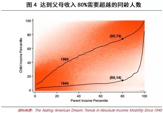 如果你出生于1940年,若想要达到父母一辈80%左右的收入水平,只需超过14%的同龄人;如果出生于1980年,则需要超过74%的同龄人,阶层固化的现象越发明显。