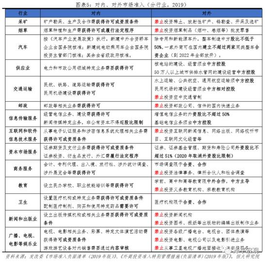 第二,限制类行业主要集中在基础能源和自然垄断行业。其中,电力业限制外资股比,国有企业垄断,资源错配。当前,核电站的建设、经营由中方控股,国有企业占据垄断地位。金融业设置外资股权比例,国有企业占主导,预计最晚于2020年4月全面开放。由于境内外市场规则制度差异、配套法律法规不到位、汇率制度等因素制约,金融业对外开放改革存在反复、缓慢等特点,目前,证券、期货和寿险外资股比不超过51%。国务院提出于2020年取消证券、期货和寿险公司的股比限制,实行全面开放。电信业限制外资股比,国有企业占主导。当前基础电信业务必须由中方控股,由于电信产业的基础性和自然垄断特性,电信对外开放进程较为缓慢,国内电信企业通过行政干预获得垄断地位,导致行业存在技术升级慢、收费高、服务差等问题。医疗业部分药品实施零关税,鼓励外资投资医药制造,但医疗机构外商投资受限。外资在中国医疗机构投资仅限于与合资、合作,目前,中国医疗资源和政策均向公立医院倾斜,2018年中国公立、民营医院诊疗人次分别为30.5和5.3亿人次。