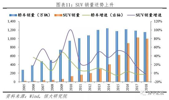2011年至今,消费政策退出,汽车销量中枢下移,但SUV凭借产品错位的生产方式迅速扩张。SUV市场占有率从8.7%升至35.6%,2011-2017年汽车产量从1841.9万辆增长至2901.5万辆,年均增速7.9%。
