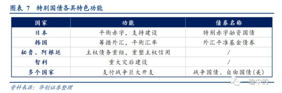 第一类功能:应对危机支持经济发展,日本几度在危机后以发行国债平衡赤字刺激需求,但最终对特别国债依赖成瘾。第二类功能:筹措外汇以平衡汇率,这是韩国稳定汇率的特别手段。第三类功能:重塑主权信用,这是秘鲁、阿根廷等发展中国家在遭遇主权信用危机时所采纳的举措。第四类功能:支持灾后重建,智利在巨大地震灾后曾发行特别国债。我国在1998年所发行的长期建设国债也有类似考虑。第五类功能:战时国债,这也是特别国债最早的历史,在一战二战时广为各国所用。