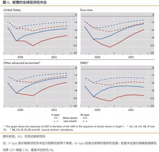 假定隔离对中国经济的影响仅限于Q1,对欧美和其他发达经济体(OAE)的影响在Q1和Q2相同,对美国和其他新兴经济体(EME)的影响程度分别是Q1占25%、Q2占75%。论文通过贝叶斯向量自回归(BVAR)对各大经济体的经济走势进行了模拟。从模拟结果来看,即使乐观假设下疫情不出现反复(二季度冲击结束),疫情对经济的负面冲击可能也会持续,后续可能只是温和回升。