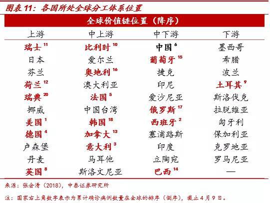 从供应链角度来看,当前多数疫情严重国处于产业链上游或中上游位置。张会清等(2018)考虑到产品的技术属性后,对全球产业链上中下游进行了划分,当前疫情比较严重的欧美经济体,主要都属于全球供应链的上中游,尤其是美国、德国、日本等均处于全球价值链上游,主导着全球价值链,中国则处于中下游或者接近中上游的位置。所以疫情导致全球产业链上游受到巨大冲击,产业链中游和下游恐怕也难以独善其身。