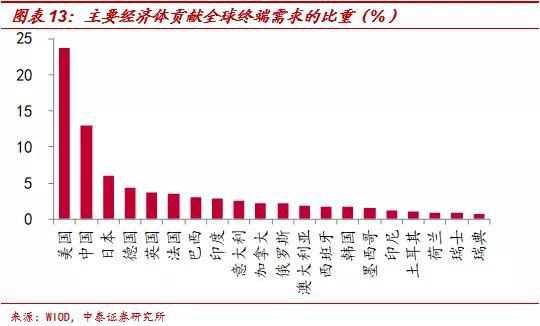 从全球需求端来看,中国也逐渐成为了全球三大需求链中心之一。早期全球需求链中心仅有美国和德国,虽然不少亚洲国家与日本关联,但更多的亚洲国家与美国联系更密切;当前,中国已经基本确立了亚洲需求链中心的地位。此外,以中、美、德为中心的三大区域中,区域内的联系更加密切,而区域间的联系有所减弱。