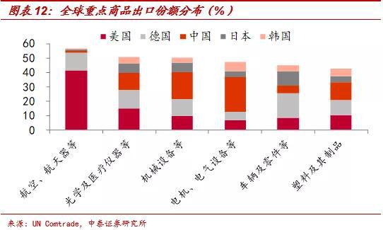 再细分一下,全球40%以上的航空航天设备出口由美国贡献,为全球最高;光学医疗设备、塑料制品出口主要由美、德、中三国贡献,均在10%以上;机械设备出口主要由中、德贡献,中国贡献接近20%;电气设备出口也主要由中国贡献,接近25%;车辆及零件出口主要由德、日贡献,分别为17%和10%。