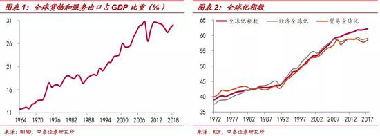 全球化程度已大幅加深。全球货物和服务出口占经济总量的比重,从1960年的11.8%大幅提升至2018年的30.1%,KOF编制的经济和贸易全球化指数也明显提高。