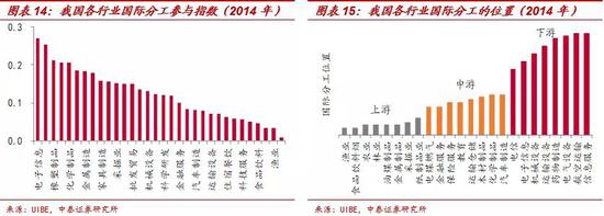 另一方面,我国科技行业多数处于国际分工的中下游。我国农林牧渔业、食品饮料业以及采掘业等初级商品领域,均处于全球产业链上游;而与高新技术相关的行业大多处于产业链的中下游位置。例如国际分工参与度最高的电子信息行业,电气设备、机械设备、药物制造以及汽车制造等技术含量相对较高的行业均是如此。