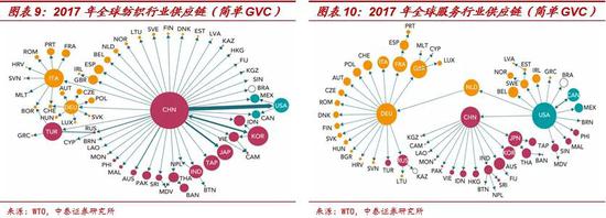 从具体行业来看,产业链格局的演变与总体趋势是一致的,但不同国家之间存在一定差异。比如,中国是全球最大的纺织业供应链中心;而美国是全球最大的服务业供应链中心。不过需要提醒的是,虽然中国也向多数亚洲国家供应服务业产品,但很多服务业最终产品的生产非常依赖于来自美国的中间品。