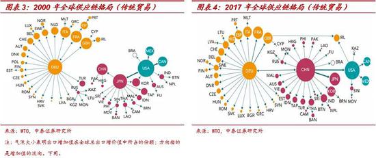 1、全球供需价值链:中、美、德三大中心。当前全球化程度较早期已有大幅提升,而全球供需产业链格局也所有变化,中国取代日本成为亚洲区域中心,形成以中、美、德为中心的新格局。不过,中国相比之前的日本,对美国的依赖度相对更低,且与更多的国家建立了密切的联系,区域内联系更加频繁。