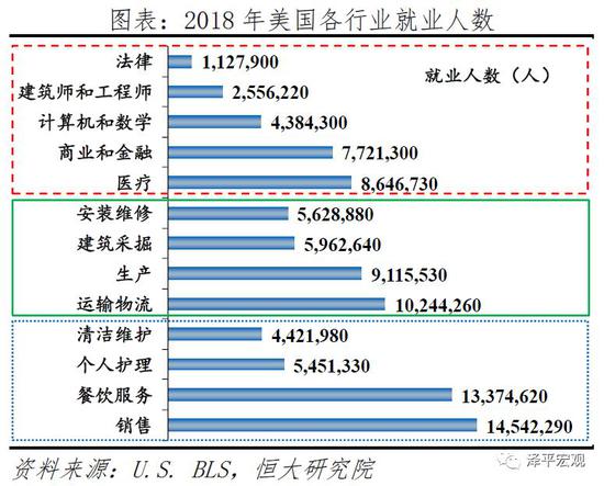 制造业岗位流失冲击蓝领工人就业。美国中产阶级的崛起依赖于制造业大发展,制造业提供了大量相对高薪且稳定的工作岗位,1913年福特汽车公司的流水线工人便是最典型的例子。因此受制造业萎缩冲击最大的就是这些蓝领中产工人。2018年美国薪资最高的是计算机、法律、金融和医疗等高端服务业,接下来是制造业,最低的则是餐饮等低端服务业。高端服务业的就业岗位有限、职业技能要求较高,因此制造业工人往往只能向低端服务业转移,收入下降且岗位不稳定。