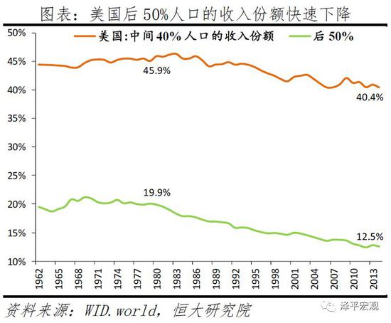 美国财富分配差距持续扩大。2014年,美国前1%的人口拥有38.6%的总财富,前10%的人口拥有73.0%的总财富;而前者在1980年的占比为22.5%,后者在1985年的占比为60.8%。2014年,后50%的人口仅拥有-0.1%的总财富,中间40%的人口拥有27.1%的总财富;后50%的人口受次贷危机冲击陷入负资产,中间40%人口的财富份额亦快速下降。