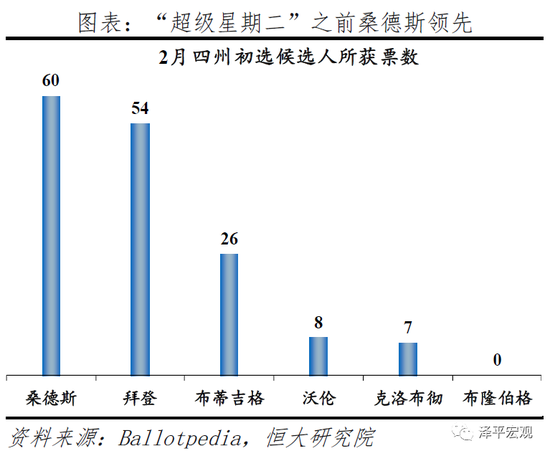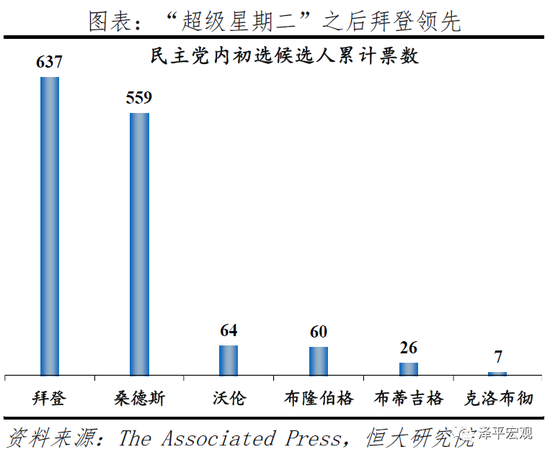民主党内拜登暂时领先桑德斯,但票数差距不大。在已公布的1355张选票中,拜登获637票,桑德斯获559票,沃伦获64票,布隆伯格获60票。而在2月的四州初选中,桑德斯略为领先,155票中获60票,拜登获54票。根据历史经验,赢得“超级星期二”的拜登最终获胜概率更大,且其获得布隆伯格、布蒂吉格、克洛布彻等退选支持,温和民主派选票归拢。