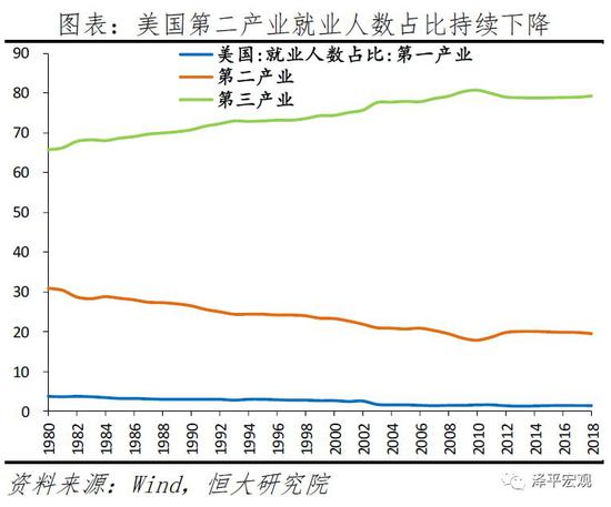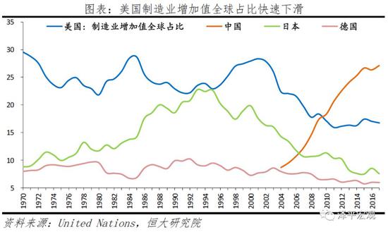 美国制造业持续外流。2001年中国加入WTO,依靠物美价廉的产品迅速抢占国际市场。美国制造业增加值占全球比重由2001年的28.3%快速下滑至2017年的16.7%,中国则从2004年的8.7%快速上升至2017年的27.1%。中国于2010年超过美国,成为世界第一制造大国。