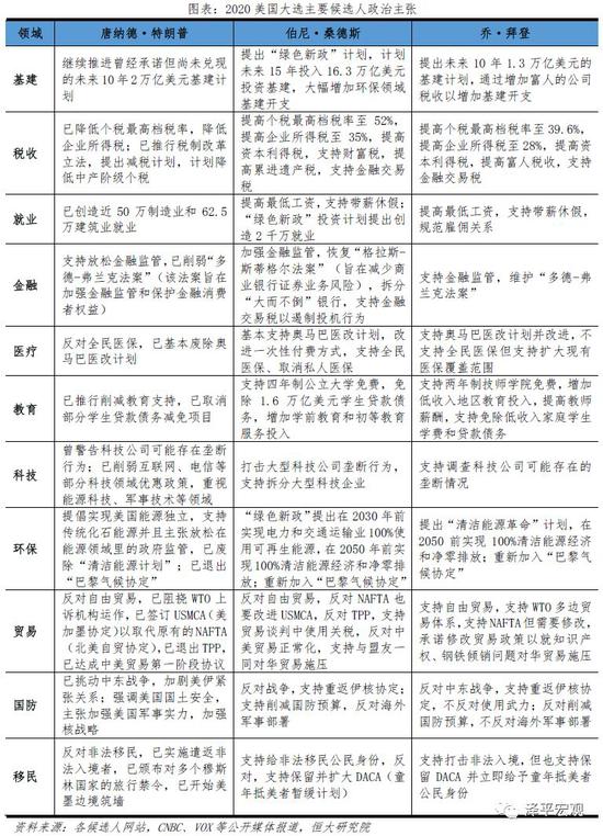 特朗普与另外二人政治主张截然不同,体现了共和党与民主党执政理念的本质区别。共和党属于保守党派,奉行文化保守主义、经济古典自由主义,倡导市场自由与效率,主张限制政府规模和政府管制,反对非法移民;民主党奉行新政自由主义理念,提倡加大政府经济干预、降低金融风险,提高社会福利和缩小贫富差距、主张“宽待”移民以及包容社会多元文化。具体来看:税收方面,特朗普拟启动“减税2.0”计划,而民主党人均提出增税计划、尤其针对富人。金融监管方面,特朗普主张放松金融监管,而民主党人均希望加强监管、限制部分银行业务以防范风险。医疗方面,特朗普反对全民医保,而民主党人均支持扩大医保范围。科技方面,特朗普对此积极性不高,甚至削弱了奥巴马时期部分科技政策,而民主党人均希望大力促进美国科技发展。环保和能源方面,特朗普对气候变化结论持怀疑态度,退出“巴黎气候协定”,并废除“清洁能源计划”,坚持发展传统能源经济;而民主党人均大力宣传“新能源”计划,呼吁2050年前实现100%清洁能源经济和净零排放,并支持重新加入巴黎协定。移民方面,特朗普强烈反对并已开始遣返非法移民,而民主党人均支持例如DACA(童年抵美者暂缓计划)等维护移民权利的法案。