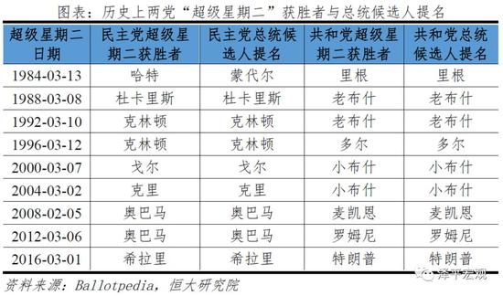 共和党内,现任总统特朗普竞选连任,获得提名没有悬念,而民主党内竞争十分激烈。民主党初选共有3979张选票,拿下1991张才可获胜。3月3日的“超级星期二”是一个关键节点,当天在加利福尼亚、得克萨斯等14州和海外领土美属萨摩亚以及海外民主党人中决出1357张选票的归属,占总票数的34%。加上2月在艾奥瓦、新罕布什尔、内华达以及南卡罗莱纳4州的155张选票,“超级星期二”的结果有很强的指示作用,领跑者优势越来越大、落后者将被加速淘汰。自1984年以来,共计18次“超级星期二”选举中,有17次都是获胜者最后获得了党内提名。