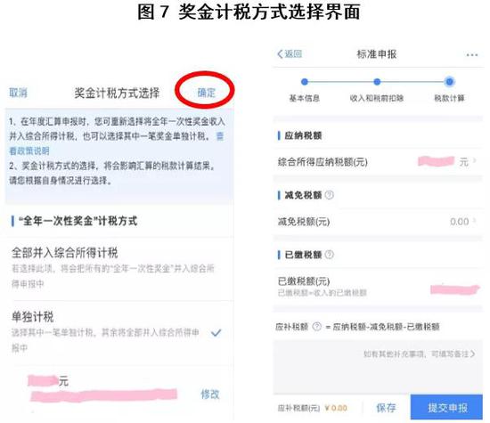首先,在标准申报页面中点击工资薪金项(图6左图),进入工资薪金详情页面(图6右图)。在这一页会显示纳税人每一笔工资薪金收入。点击奖金“计税方式选择项”,进入奖金计税方式选择页(图7左图):