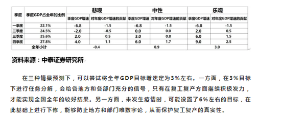 在三种情景预测下,可以尝试将全年GDP目标增速定为3%左右。一方面,在3%目标下进行任务分解,会给各地方和各部门充分的信号,只有在复工复产方面继续积极发力,才能实现全国全年的较好结果。另一方面,未发生疫情时,可能设置了6%左右的目标,在此基础上进行下修,能够防止地方和部门唯数字论,从而保护复工复产的真实性。