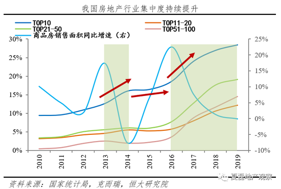 2011-2016年,TOP10、TOP50和TOP100房企市占率年均提升1.5、2.7和3.2个百分点,而2017-2019年分别加速至3.3、9.2和12.9个百分点。