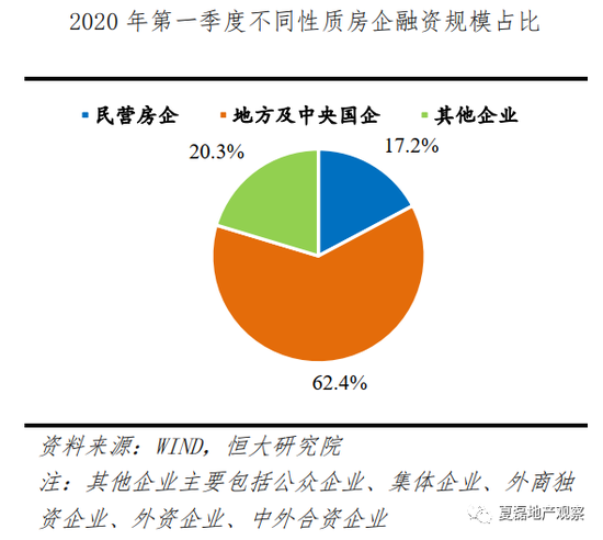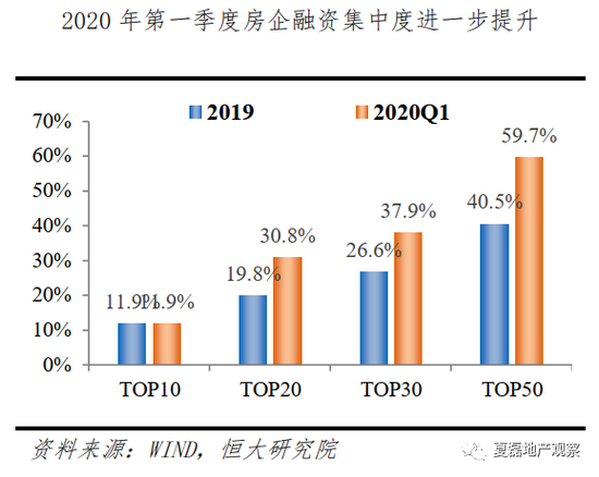 以信用债为例,2020年一季度房企合计融资1655.5亿元,较2019年四季度增加了90.5%,主要受益于年初流动性宽松。其中,民营房企占比仅17.2%,较2019下降了3个百分点,已连续2年下滑,国资背景房企融资占比高达62.4%。前20和前50房企融资占比分别为30.8%和59.7%,较2019年大幅提升了11个和19.2个百分点。