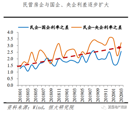 从融资成本看,债券、银行贷款等低成本融资渠道具有较高准入门槛,且行业分化加剧和房地产金融调控下房企融资信用利差加大,大房企和国有房企信优势凸显。以2019年合同销售额前100中的上市房企为例,2016-2018年前10名的平均综合融资成本分别为5.4%、5.3%、5.7%,均显著低于后10名的8.1%、6.7%和7.1%。从信用债发行利率看,2020年一季度,民营房企平均发行利率为5.86%,远高于国企和央企的4.09%和3.09%,且近年来信用利差持续扩大。