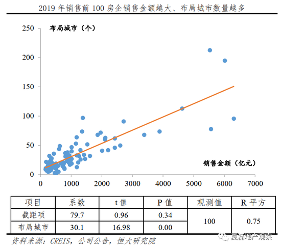 实际数据也表明,增加进驻城市、完善区域布局是房企规模持续增长的必由之路。根据中指院数据,2019年合同销售Top100房企的销售金额和布局城市数量明显正相关。以销售金额为因变量、布局城市为自变量做回归分析发现,布局城市对销售规模有显著影响,每多布局一个城市,销售金额增加30.1亿元。