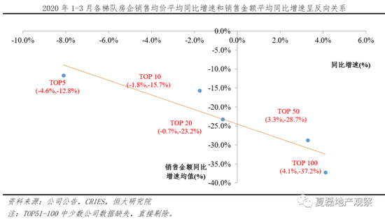 二是大房企能及时通过加强线上营销、优惠促销力度等措施灵活应对疫情,销售业绩受市场冲击小。2020年1-3月TOP5、10、20、50和100房企,销售金额平均同比增速依次递减,分别为-11.7%、-15.7%、-23.2%、-28.7%和-37.2%;而销售均价平均同比增速递增,分别为-8.1%、-1.8%、-0.7%、3.3%和4.1%。