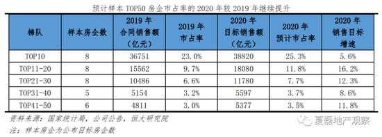 市场总量稳定情况下,大房企销售稳定增长,将推动房地产行业集中度持续提升。以2020年为例,市场降温叠加疫情影响,预计全国商品房销售金额同比减少4.1%。而公布销售目标的33家TOP50房企,总金额比2019年增长9.5%,预计市占率比2019年提升6.5个百分点。