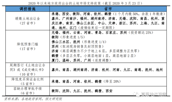 为稳定土地市场,2月以来地方政府出台多项政策。一是减少拿地限制、降低拿地门槛,主要包括降低预售门槛、降低竞买保证金比例等;二是帮助房企履约,包括缓缴土地出让金、延期签订《土地出让合同》、容缺办理审批手续、可申请延期开竣工时间等;三是增加优质住宅用地供应,吸引有资金的房企竞拍。