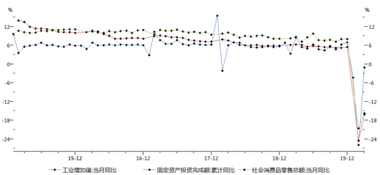 一季度国内生产总值206504亿元,按可比价格计算,同比下降6.8%。分产业看,第一产业增加值10186亿元,下降3.2%;第二产业增加值73638亿元,下降9.6%;第三产业增加值122680亿元,下降5.2%。3月份规模以上工业增加值同比下降1.1%,降幅较1-2月份收窄12.4个百分点。3月份社会消费品零售总额26450亿元,下降15.8%,降幅比1-2月份收窄4.7个百分点,一季度社会消费品零售总额78580亿元,同比下降19.0%。一季度,全国固定资产投资(不含农户)84145亿元,同比下降16.1%,降幅比1-2月份收窄8.4个百分点。3月份,全国城镇调查失业率为5.9%,比2月份下降0.3个百分点。整体来看,消费、投资的增速仍处于非常低的水平。