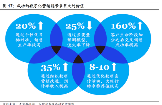 (2)精准营销全面提升产能效率。通过整合多方数据,从多个维度实现对一个用户的深度理解和精准化定位,洞察用户的潜在需求,并针对性的推出个性化的品牌和营销策略,精准获取用户的同时有效降低获客成本、提高获客效率。根据麦肯锡的实践经验,成功的数字化营销能让银行销售生产率提高20%;客户流失率下降25%;交叉销售成功率提高160%;银行整体运营效率和业务表现也会显著提升,年收入增长35%;净推荐值可上升8-10。